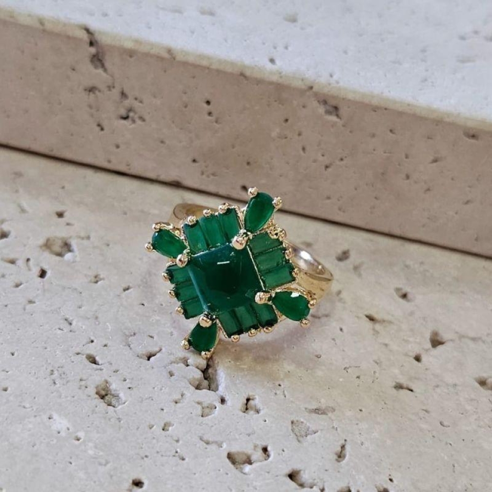 O tom verde transmite elegância e presença. Para um visual ainda mais refinado, combine com acessórios no mesmo banho e unhas em tons nude, verde escuro ou até um esmalte transparente para deixar o anel brilhar sozinho.