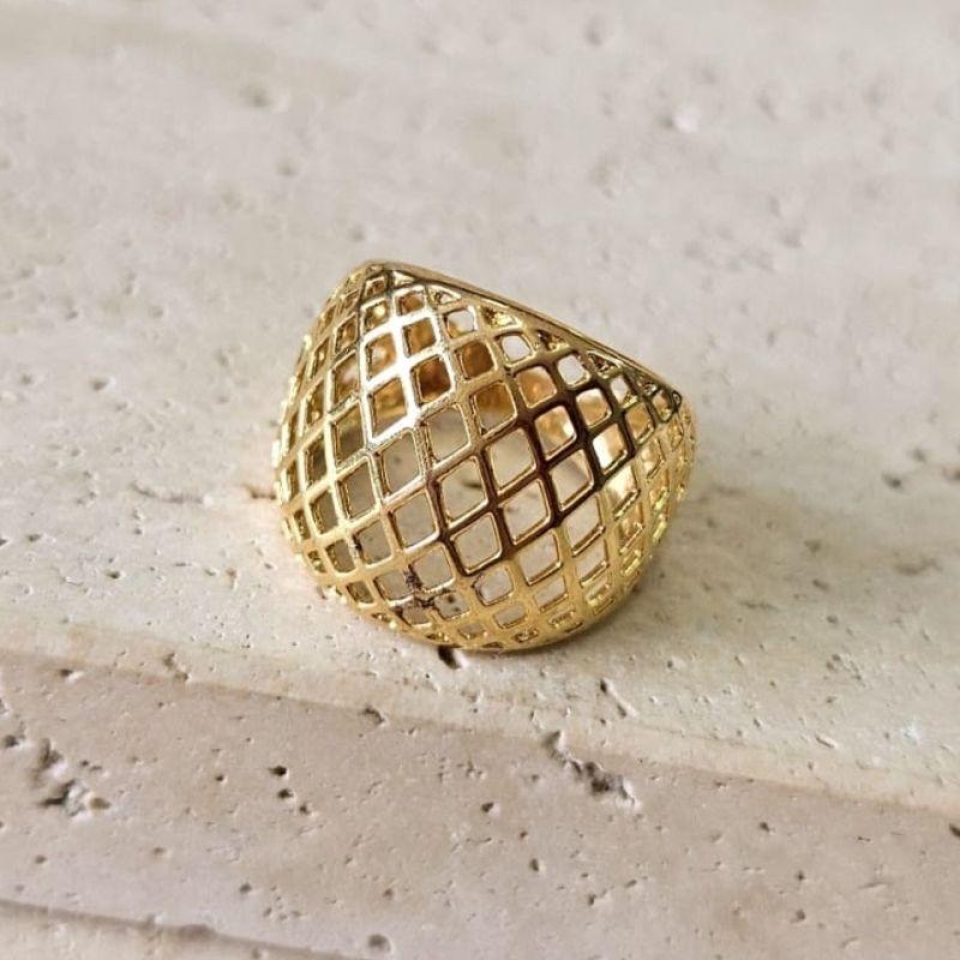 FECHARAnel vazado telinha em metal dourado, com design contemporâneo e acabamento polido que realça o brilho da peça. A estrutura delicada em formato de rede (telinha) cria um visual leve e moderno, perfeito para quem ama semijoias cheias de personalidade e estilo. Um acessório versátil que valoriza qualquer look, do dia a dia às ocasiões especiais.