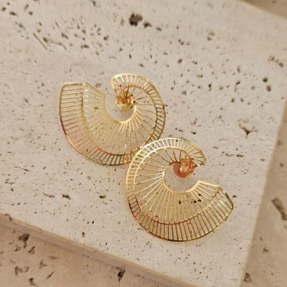 Seu design inspirado em formas geométricas e naturais cria um visual fluido e contemporâneo. O acabamento dourado espelhado realça o brilho e traz um toque artístico ao look.