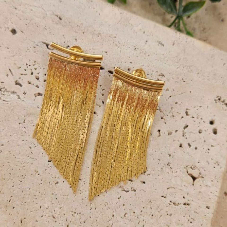 Seu design moderno combina fios metálicos dourados em diferentes comprimentos, criando um efeito de leveza e movimento que brilha a cada passo.