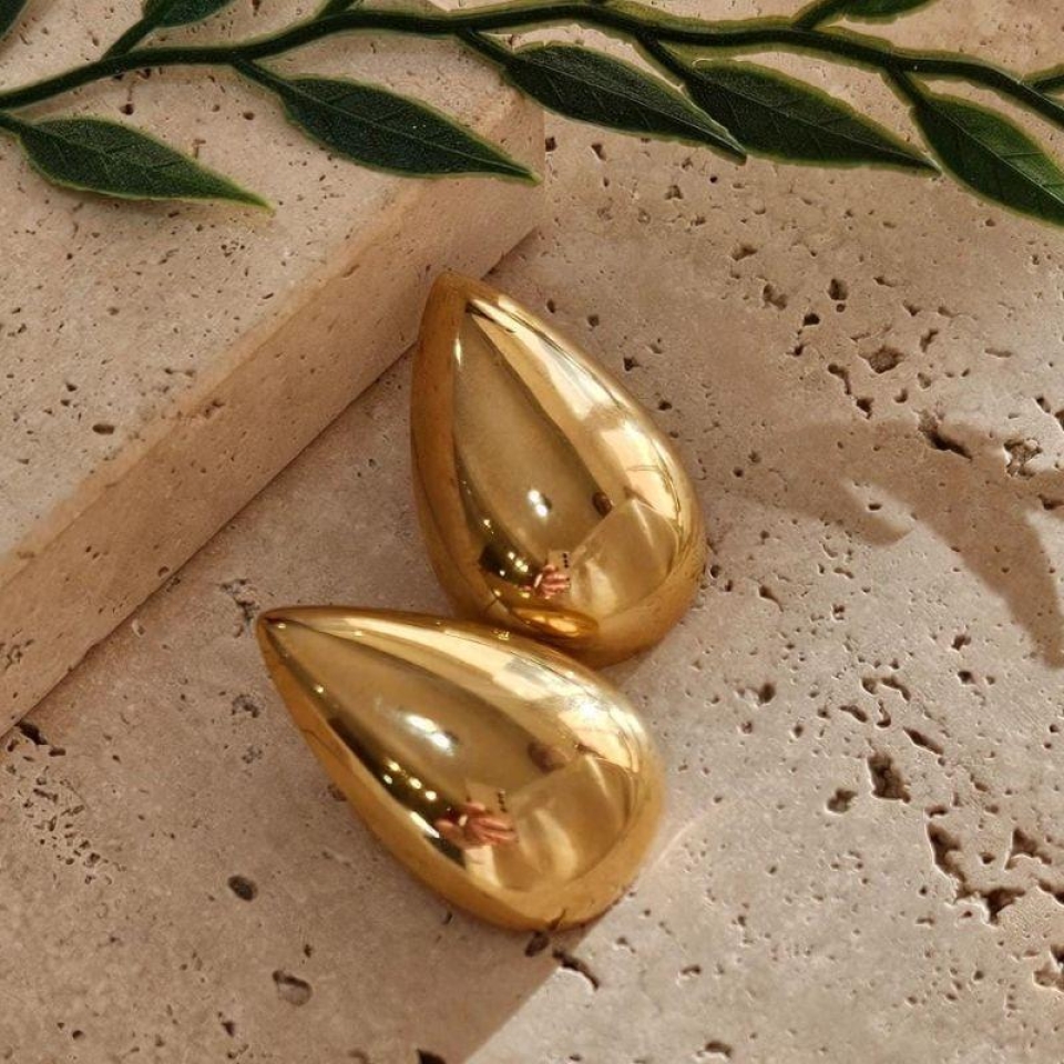 Seu design em formato de gota lisa, com acabamento espelhado em dourado intenso, reflete a luz de forma delicada, realçando a beleza natural do rosto.