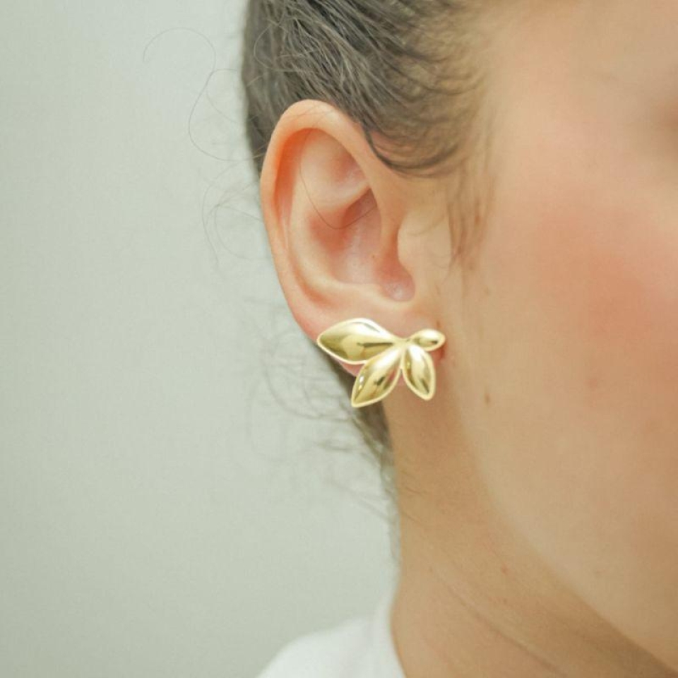 Use blazer de cor clara com regata acetinada e calças de alfaiataria. As pétalas douradas dos brincos criam um ponto de luz sofisticado, ideal para um visual profissional elegante. Combine com anel dourado minimalista para manter a harmonia.