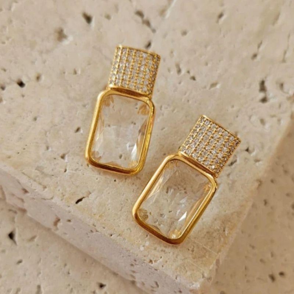 Brinco Pedra Retangular com Base Cravejada