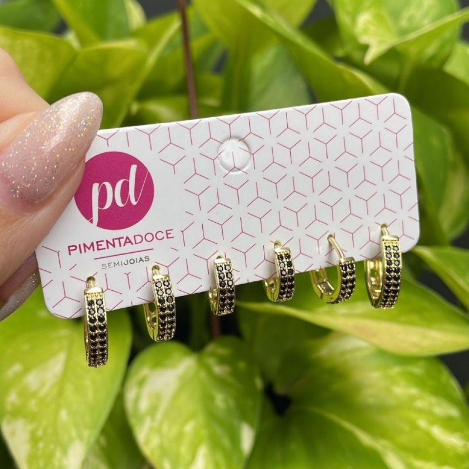 Brinco Trio Argolas Zirconias Negras